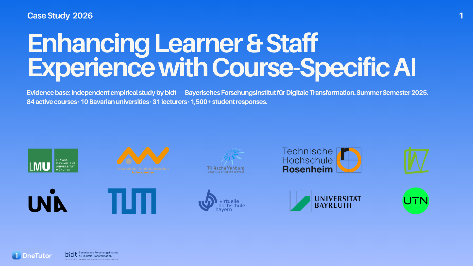 First results from an ongoing independent bidt study evaluating OneTutor across 84 courses at 10 Bavarian universities during Summer Semester 2025, with 31 lecturers and over 1,500 student responses. 86% of students found it helpful for exam preparation and 84% of lecturers would deploy it again. Read the full case study for the methodology, satisfaction metrics, and what these early findings mean for AI in higher education.